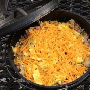 - In separate skillet, scramble eggs; season with salt and pepper. Cook and stir until eggs are set. Add eggs to Dutch oven on top of potatoes and ham.