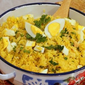 Kedgeree is an English breakfast made of rice and eggs, fish and peas. But don't limit yourself to breakfast! Kedgeree is delicious any time of the day.